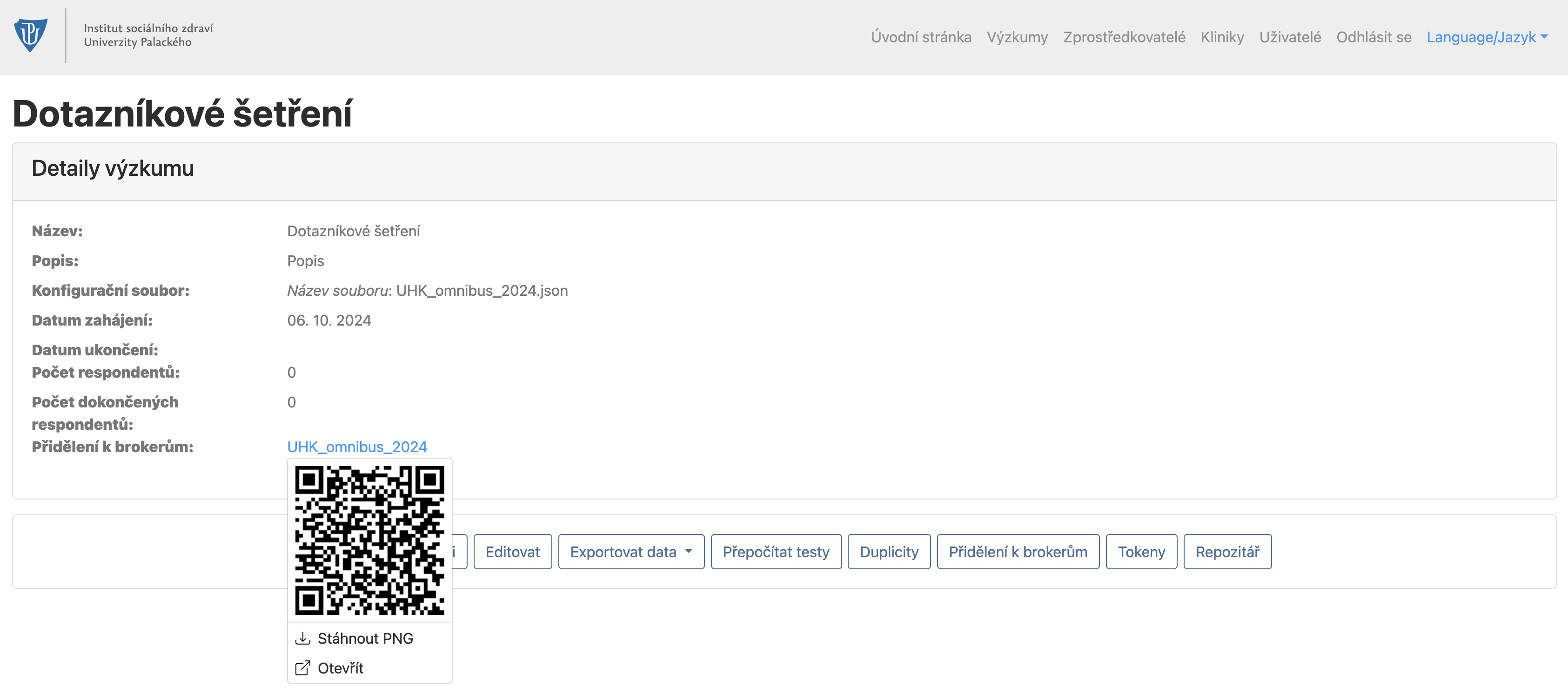 Každý výzkum, v části Přidělení k brokerům, obsahuje QR kód s odkazem na dotazník.