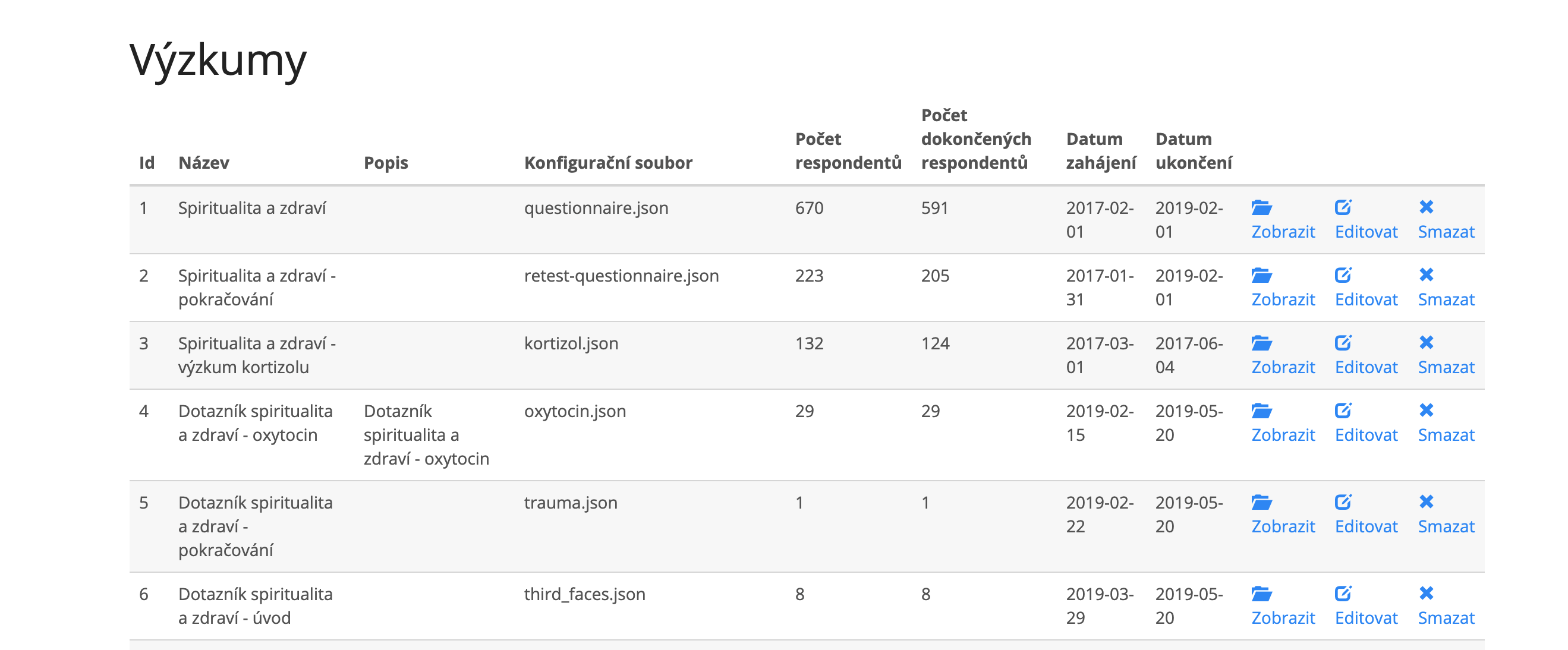 Jednotlivé výzkumy můžete Zobrazit - tj. zobrazí se všichni respondenti v daném výzkumu, Editovat, upravíte parametry výzkumu a Smazat.